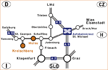 Aus Graz: Richtung St. Michael, A9, Mautstelle, Richtung A1 Ring, Judenburg, Scheifling, Murau, nach Murau noch 7 km bis St. Georgen/St. Lorenzen